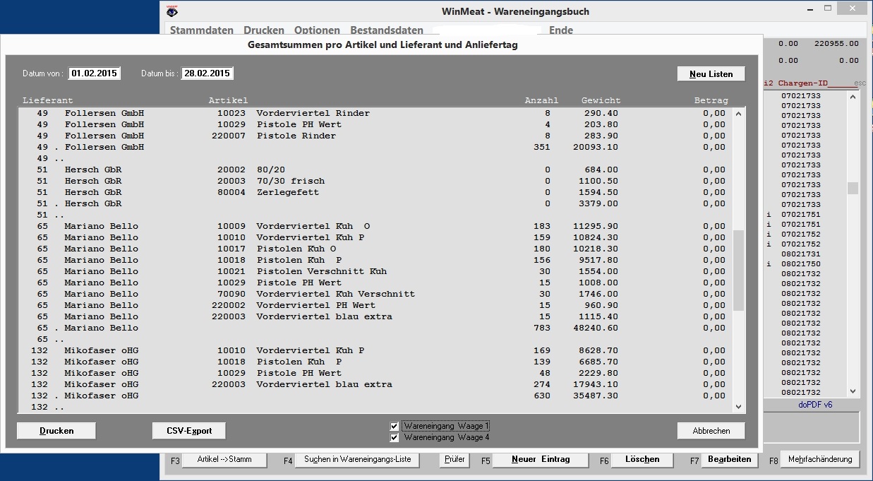 Wareneingangs-Statistik mit Filter : Lieferant + Artikel